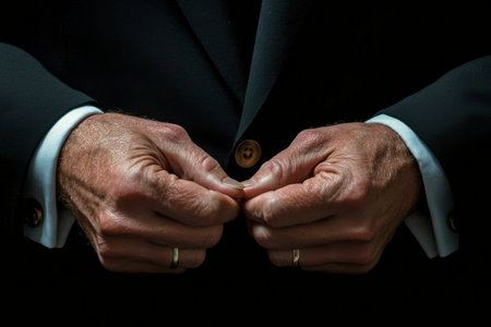 A man wearing a tailored dark suit rests his hands on a black table, creating an atmosphere of contemplation in a softly lit environment. The scene suggests deep thought or preparation.