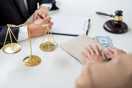 Businesswoman gave the lawyer money to help with the case and sign the contract at the office.