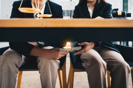 Bribery and corruption concept, bribe in the form of dollar bills, Businesswoman giving money to male lawyer while helps making deal to agreement a real estate contract and financial corporate.