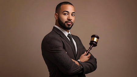 In a quiet courtroom, a Black man stands confidently before the judge's bench, embodying dignity and the pursuit of justice.