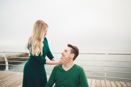 Happy couple on the pier, young family in love spending honeymoon vacation luxury islands.