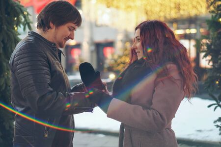 Loving couple in festive Christmas city celebrate the New Year. Romantic walk in winter. Having fun in winter christmas fair market decorations at central square city. Vacation and holiday concept