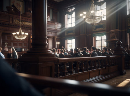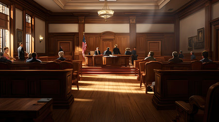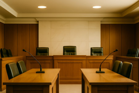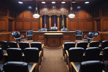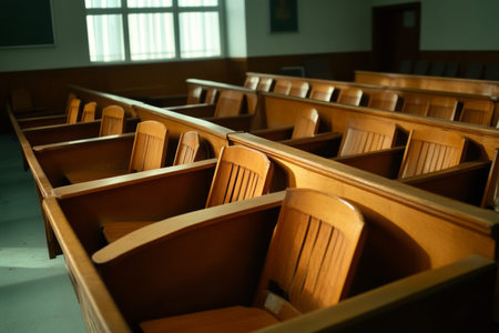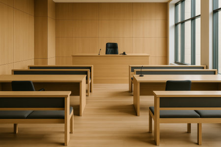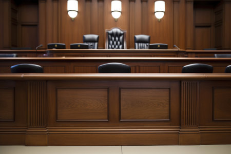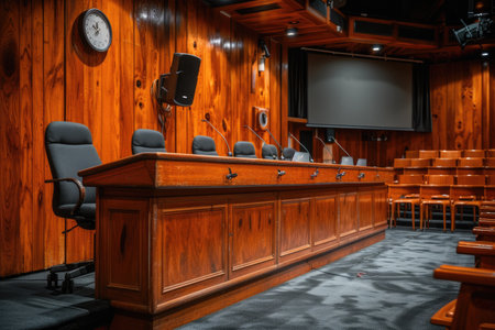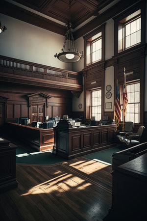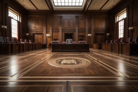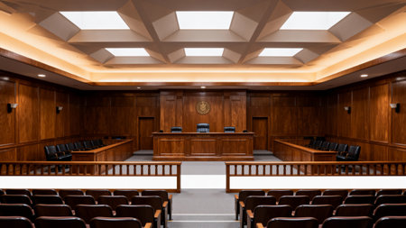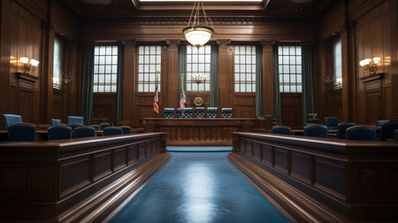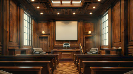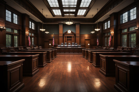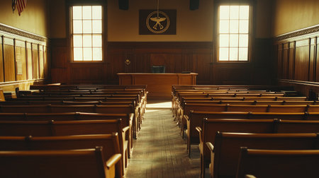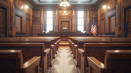 Empty courtroom interior with rows of wooden benches, judge bench, and legal symbols, representing law and justice in a serene setting