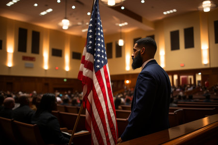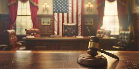 American courtroom with United States flag judges gavel and justice symbol. Concept Law & Order, Courtroom Drama, Legal Systems, Justice Symbols, American Judiciary
