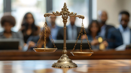 An ornate scale of justice stands prominently on a table in a courtroom, with a blurred group of people in the background symbolizing fair play and innovation for law firm services A lawyer, who is