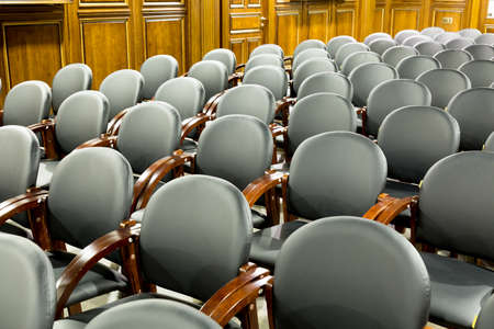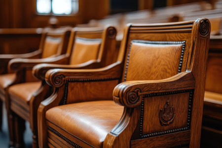 Wooden courtroom chairs arranged neatly in a historic legal setting