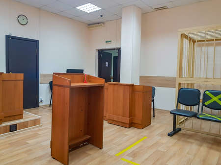 Moscow, Russia - March 1, 2021: Interior of the courtroom of the magistrate in the Meshchansky district