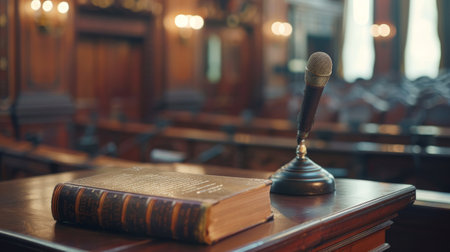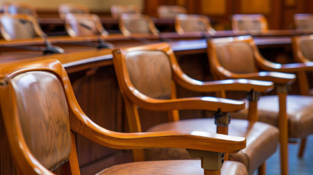 Close up image of a courtroom setting, emphasizing legal proceedings, justice, and the judicial environment.