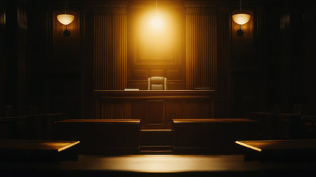 In the quiet stillness of an empty courtroom, a judge's gavel rests on its block, bathed in warm light.