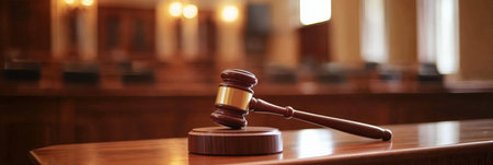 Gavel rests on a sound block on a wooden desk in a courtroom, symbolizing justice and legal decisions