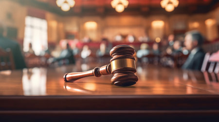 A Gavel Poised on the Tabletop Against a Blurred Courtroom Backdrop. Generative AI