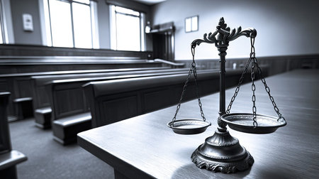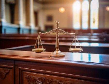 A close-up view of elegant scales of justice positioned in a quiet courtroom, highlighting themes of law, fairness, and the judicial system in a serene environment.