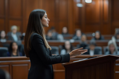 A young lawyer passionately defends her client, presenting a compelling case in a courtroom witness stand.Generated image