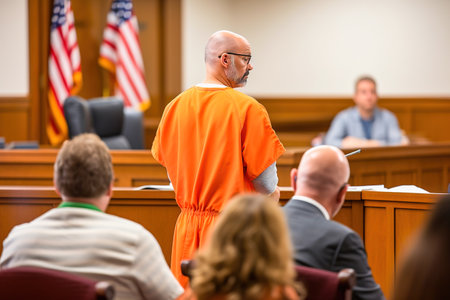 A convict in an orange suit speaks in the courtroom. high quality photo