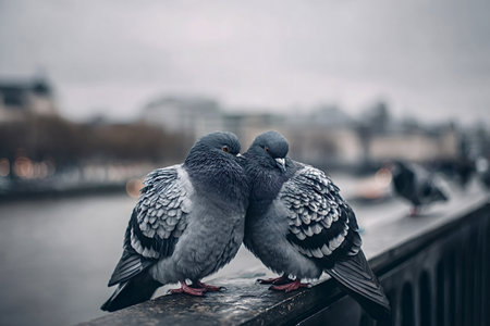 Two pigeons are sitting closely together on a dark fence or railing, displaying affection and togetherness in an urban environment with a blurred city background