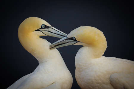 Close-up of a couple of northern gannets greeting each other