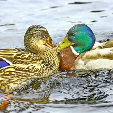 pair of ducks kissing while standing in water