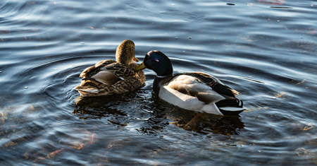 Two ducks swimming on Lake Mead, Nevada, USA. Copy space for text