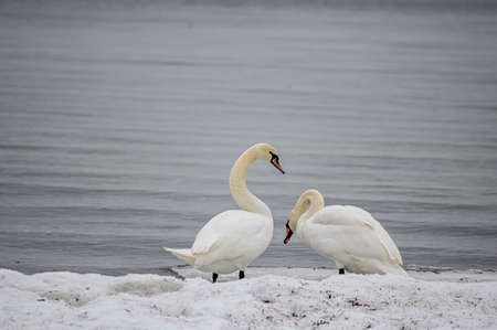 Couple white of swans rested on the frozen sea shore in winter.