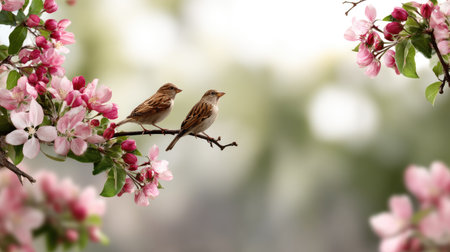 Two adorable sparrows rest on a blooming branch in gentle morning light. This serene nature scene captures the beauty of wildlife and the essence of spring.