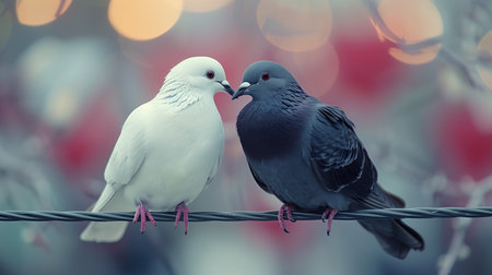 A creative digital illustration depicting Cute love birds perched on a heart perch with ribbons, balanced twin composition, soft studio key light, avian photorealism style, harmonious couple mood, feather precision stock.. This AI-generated artwork features unique visual elements suitable for various commercial and editorial applications. AI-generated illustration.