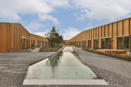 This image showcases a modern building exterior featuring a minimalist design aesthetic. The composition highlights geometric lines, dark tones, and reflective glass. A meticulously landscaped garden with rocks, plants, and a reflecting pool offers a serene contrast. Suitable for architectural, design, and lifestyle visuals.