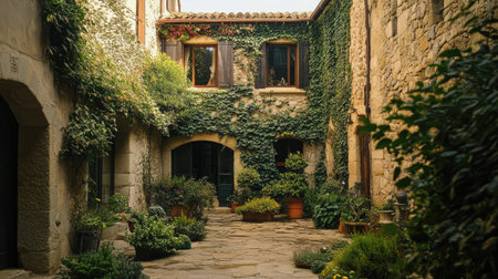 A serene courtyard situated in a historic building, covered in ivy and surrounded by lush plants, offers a tranquil outdoor space perfect for relaxation.