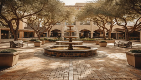 A serene courtyard scene showcases a central fountain surrounded by benches and flourishing greenery. The composition features a textured stone facade and arched openings, with plants adding natural elements. The lighting suggests a bright day, creating a peaceful and inviting environment. Suitable for a variety of editorial and commercial applications.