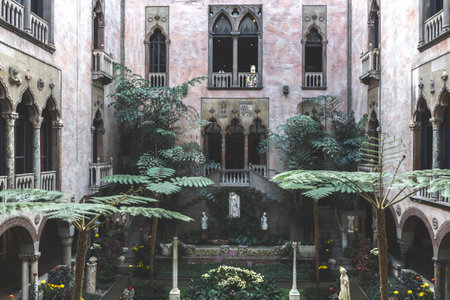 Boston, USA - October 22, 2021: View of the courtyard of Isabella Stewart Gardner Museum in Boston. It has collection of paintings, sculpture, tapestries and other art.