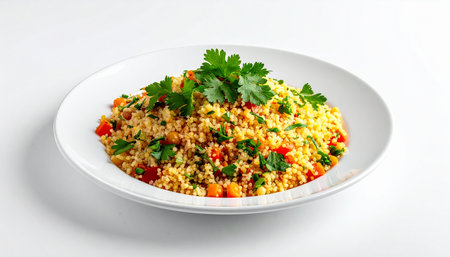 Plate of couscous with vegetables and parsley on white background