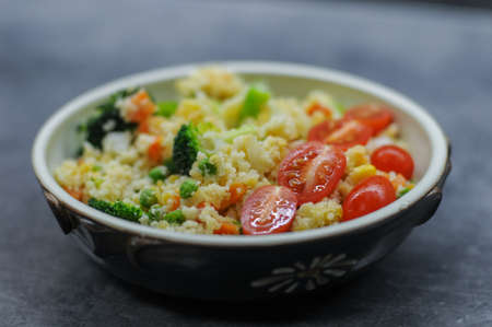 Couscous with vegetables on black stone background