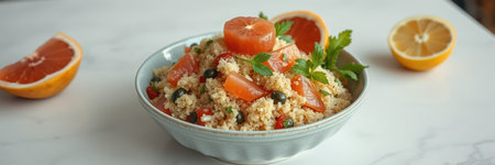 Colorful quinoa salad with cherry tomatoes and herbs on a blue table