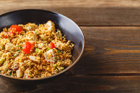 Couscous with vegetables on wooden table