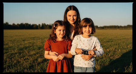 Three young girls standing together in a grassy field at sunset, smiling at the camera. The older girl is wearing a white top, while the younger girls are in a red dress and a white top with blue jeans.