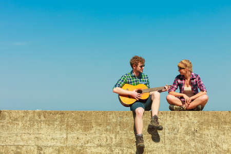 Young man playing guitar to his girlfriend outdoor sunny summer day sky background - dating romantic couple