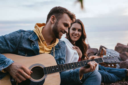 selective focus of bearded man playing acoustic guitar near girlfriend and bonfire