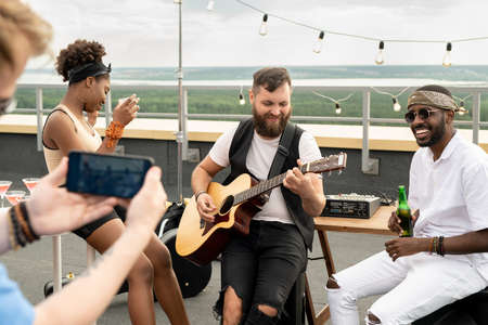 Multracial friends with drinks enjoying rooftop party while one of them shooting video