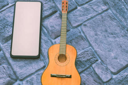 Phone with space for text, acoustic guitar on a cobbled grey blue background