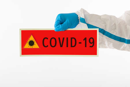 Detail of the arms of a medical nurse wearing a PPE and latex gloves with a red sign that reads: 'COVID-19'. Coronavirus, pandemic and health concept.