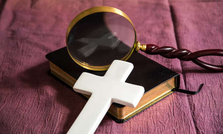 A bible, cross and magnifying glass. The cross is reflected in the glass of the magnifying glass.