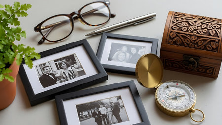 Top view of vintage photo frames, compass, eyeglasses and green plant on white table