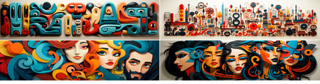 collage of 4 photos. The characters are drawn in a unique pop art style with rounded shapes. Animation brings characters to life with vibrant colors and movement. Optical illusions d