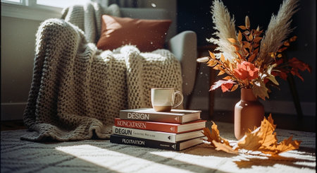 A cozy living room scene featuring a vase with dried flowers, a coffee cup on a stack of books, and soft sunlight streaming through blinds