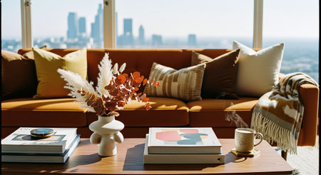A modern living room with a stylish sofa, decorative pillows, a coffee table with books and a vase, and a city skyline in the background