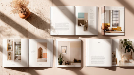 Flat lay arrangement of printed portfolio pages showcasing interior projects, neutral modern design with stylish grid layout