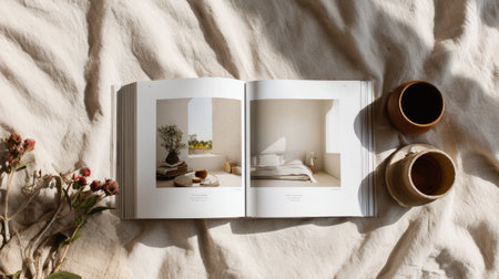 Flat lay of interior design portfolio on linen background, soft natural light, clean modern structured layout, stylish look