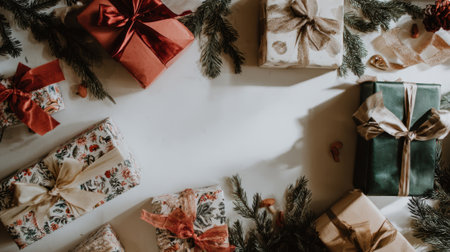 A collection of beautifully wrapped Christmas gifts and festive greenery arranged in a circular pattern, leaving a central space for custom text or design.