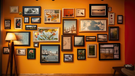 Framed visuals of diverse subjects are arranged on a sleek wall, creating a captivating gallery that combines modern design with artistic expression.