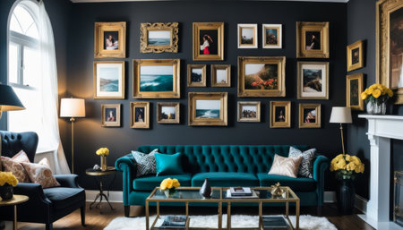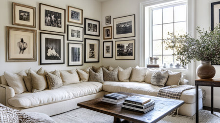 A stylish living room with a gallery wall filled with framed photographs and artwork, paired with a cozy sofa and chic coffee table for an artistic touch.