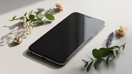 A smartphone rests alongside floral arrangements on a neutral surface. The image showcases a modern device with a reflective black screen. The composition is lit by natural sunlight, casting soft shadows. This setting suggests a lifestyle or product photography scenario that could be used for various commercial projects.